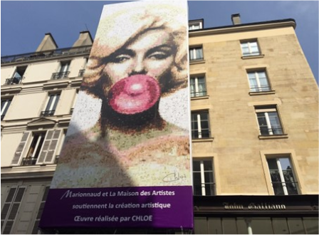 A l’occasion d’un ravalement au 384 rue Saint Honoré (Paris 1er). Œuvre d’environ 100m2 représentant le visage iconique de l’actrice Marilyn Monroe recomposé – comme autant de pixels – par des centaines de portraits de femmes anonymes. L’artiste souhaitait offrir une double proposition : celle d’une femme universellement reconnue pour sa beauté et celle d’une mosaïque de femmes anonymes et diverses qui atteste que la beauté est universelle, peu importe l’âge, l’origine ou le physique. « La vision de la beauté n’est pas uniforme […] mais bien unique et propre à chaque femme ». Un propos de l’artiste qui était en parfaite adéquation avec le discours de la marque et sa baseline : « j’ai trouvé mon beauty code et vous ? »Ce projet a pu être réalisé grâce au soutien de Marionnaud en partenariat avec la Maison des Artistes.