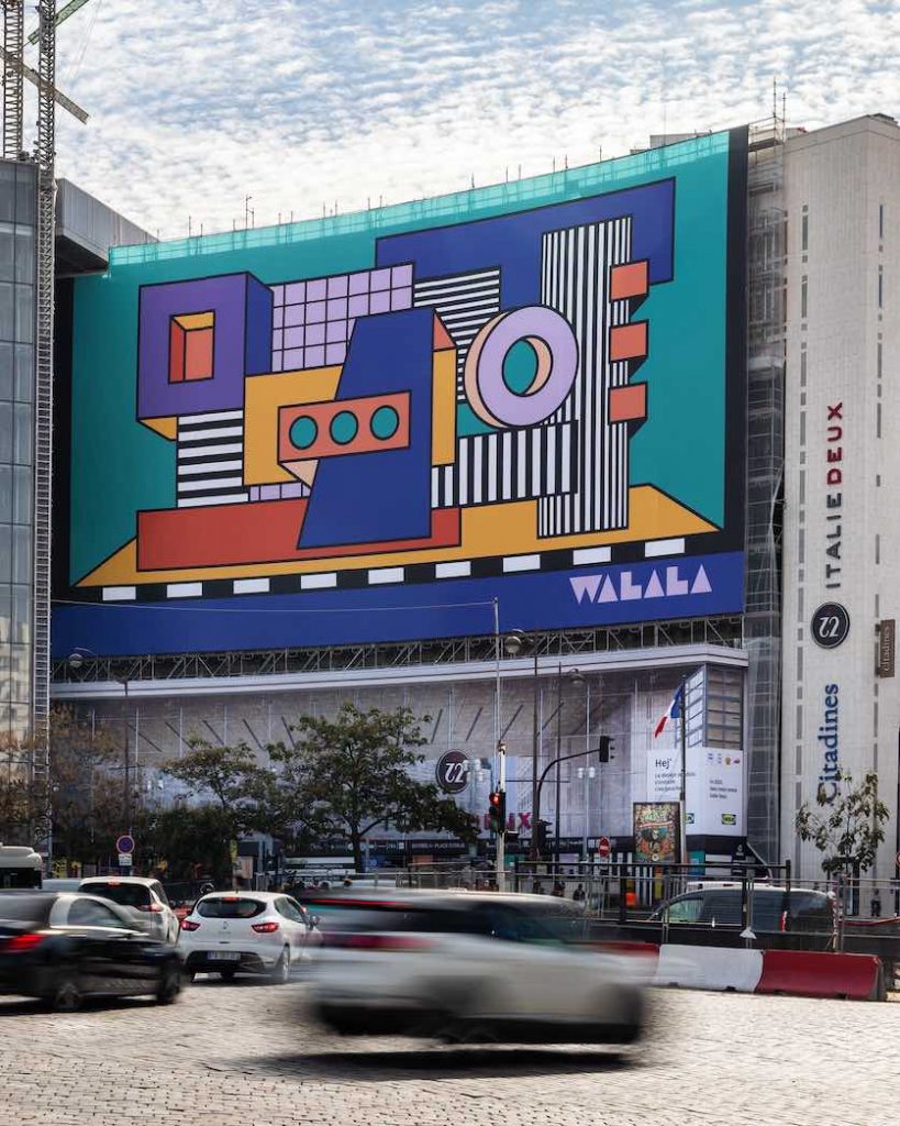 Camille Walala a été sélectionnée pour son art qui éveille les sens et propage la joie. Avec un penchant pour un style « tribal pop » inspiré par le mouvement Memphis, la tribu Ndebele, et le maître de l’optique Victor Vasarely, elle mise sur des formes géométriques et asymétriques, une palette de couleurs vivantes, et des motifs osés. Les passants affichent un sourire. À la Place d’Italie, le spectacle se poursuivra jusqu’au printemps 2024.