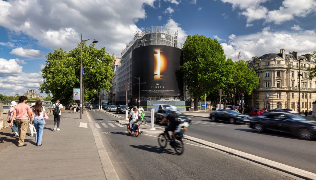 Réalisée en 2025, l’œuvre monumentale “Projection” habille la façade emblématique du bâtiment d’angle reliant les quais de Seine au quartier Saint-Germain.