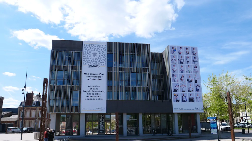 Nous sommes ravis de vous présenter une œuvre monumentale sur la façade de l’Hôtel d’Agglomération à Louviers. Cette création artistique célèbre la fraternité et les valeurs olympiques qui nous sont chères.